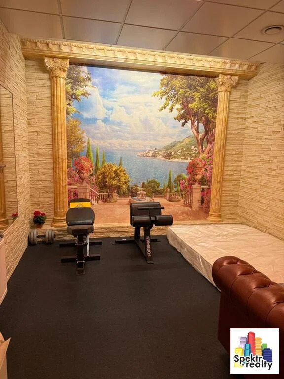 На первом этаже: нежилое помещение, техническая мастерская, постирочная, крытый тёплый гараж на 2 машины, фитнес-зал, санузел, душевая, технические помещения и кладовая.