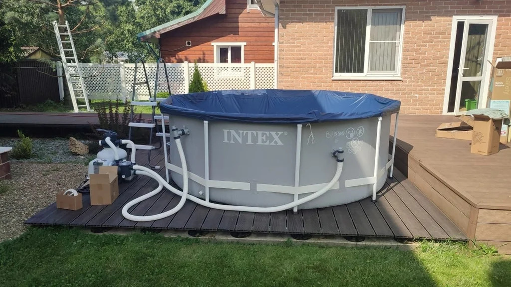 На участке есть хозблок, машино-место, бассейн и баскетбольная площадка
